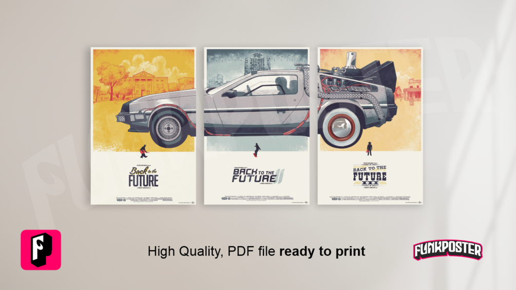 This is a new version of the Triple Poster of Back to the Future Trilogy, with new wheels that go according to the scenes of the third movie of the saga. With a classic air the Delorean looks incredible.